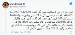 Murad Saeed shared the ministry’s three-year performance on Twitter, saying that Rs24.2 billion was recovered through accountability, Rs1 billion was saved through austerity, and state-owned land worth Rs5 billion was also reclaimed.
