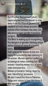 “Joyland not only depicts an adulterous affair between two men, but it also promotes gender transition surgery,” the designer stated in her stories.