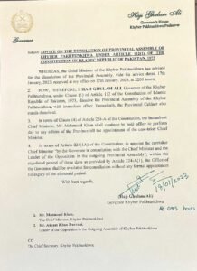 Following the dissolution of the Punjab Legislature just a few days prior, Governor Haji Ghulam Ali signed the summary on Wednesday dissolved the province assembly on advise of Khyber-Pakhtunkhwa (K-P) Chief Minister Mahmood Khan.