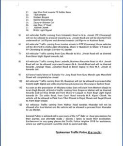 According to the police, once the procession leaves Shaheen Masjid Kharadar and Memon Masjid, all vehicular traffic from the Lea Market, Agha Khan Jamat Khana, Kharadar, Crane Chowrangi, G. Allana Road, and Mai Kolachi sides will be diverted away from MA Jinnah Road.