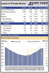 Auto financing in Pakistan continued its upward momentum in January 2026, reaching Rs. 328 billion, compared to Rs. 242 billion in January 2025, according to data compiled by Arif Habib Limited, citing figures from the State Bank of Pakistan.