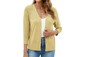 Spring weather can be unpredictable, and this three-quarter-sleeve cardigan is designed for easy layering. Featuring a delicate crochet pattern and ribbed cuffs, it adds warmth without bulk and works well over dresses, tanks, or tees.
