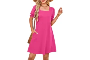 This square-neck mini dress is a standout for its flattering fit and charming details. With puff short sleeves, a structured neckline, and practical side pockets, it works equally well for brunch, office wear, or weekend getaways. It is the kind of dress that can be styled up or down with ease.