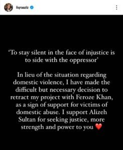 Iqra wrote in her Instagram post, “To stay silent in the face of injustice is to side with the oppressor… I have made the difficult but necessary decision to retract my project with Feroze Khan as a sign of support for victims of domestic abuse. I support Aliza Sultan for seeking justice, more strength, and power for you.”