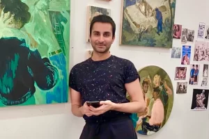 Salman Toor is an American of Pakistani origin. He works as a painter and is 40 years old. His works depict the imagined lives of young South Asian men, displayed in close-up in either South Asia or New York City fantasy settings.