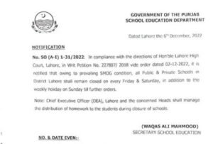 The notification issued by the Punjab School Education department said “In compliance with the directions of Lahore High Court, it is notified that owing to prevailing smog condition, all public and private schools in the district shall remain closed every Friday & Saturday, in addition to the weekly Middy on Sunday till further orders.